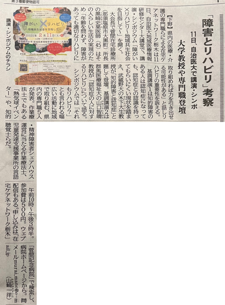 2025年2月11日(火/祝) 自治医科大学 地域医療情報研修センター大講堂にて「在宅ケアネットワーク栃木」が開催されます。大会長には博愛会 地域包括総合ケアセンター 黒崎史果センター長が任命されています。ふるってご参加ください!
